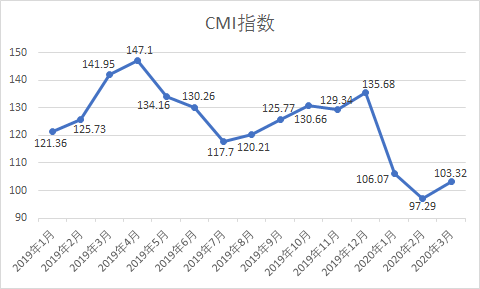 匠客工程機(jī)械數(shù)據(jù)顯示,2020年3月份中國工程機(jī)械市場指數(shù)即CMI為103.32,同比降低27.21%,環(huán)比提高6.20%(依據(jù)CMI判斷標(biāo)準(zhǔn),CMI降略高于衰退點(diǎn)100,市場短期仍受疫情影響,但下滑趨勢(shì)減弱)。