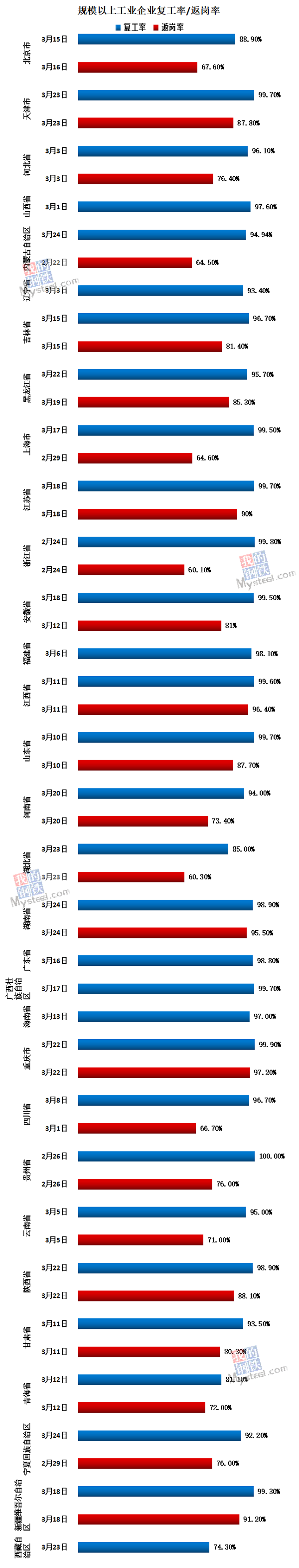 Mysteel統(tǒng)計(jì)數(shù)據(jù)顯示,截至3月26日,27省市規(guī)模以上工業(yè)企業(yè)復(fù)工率超過90%,江蘇、江西、湖南、重慶、新疆等省份人員返崗率超過90%。各地重大項(xiàng)目也陸續(xù)開工。